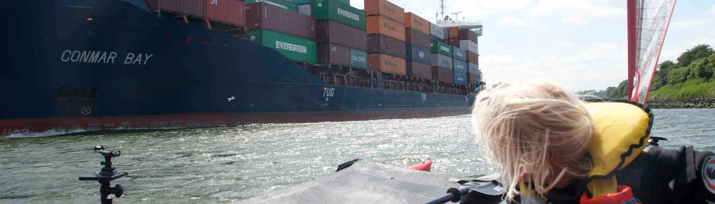 Time for a break and we tied up the kayaks at the side, ships started to yell that it was to dangerous and at the end a tour boat came right up to us and told us to get lost. I said ok and we started to pack again. Two minutes later he came back again and gave us the same message. We thought that he wanted to stop where we were. So I paddled both kayaks away, but I forgot to pull up the rudder on the kayak in the back and had problems steering them. The tour boat just went away. This was probably the most dangerous situation so far. Around the next bend a mega big container ship was coming and I was trying to pull up the rudder and getting both kayaks out of the way. I was saying a lot of bad words towards the tour boat captain and myself for not just taking it easy and think.
