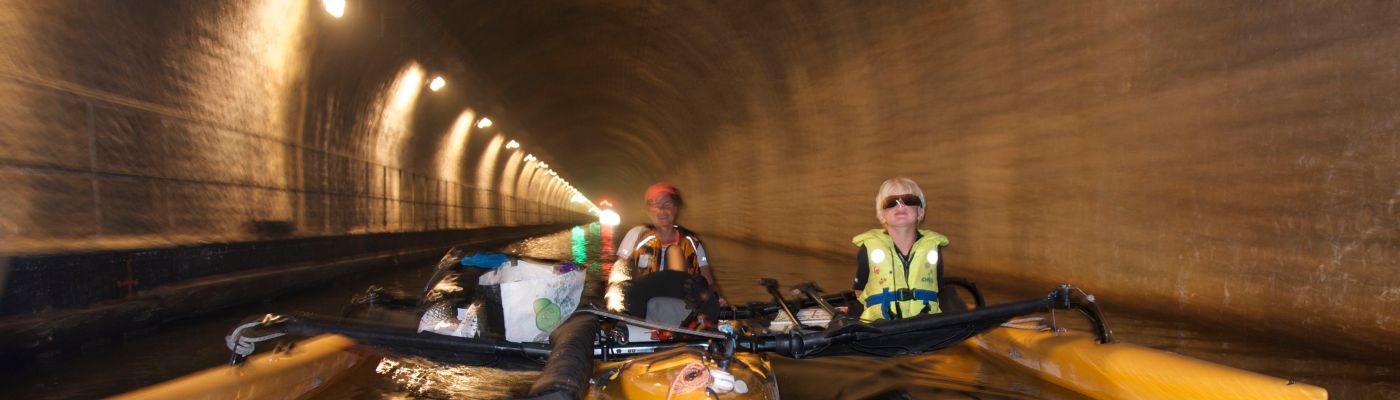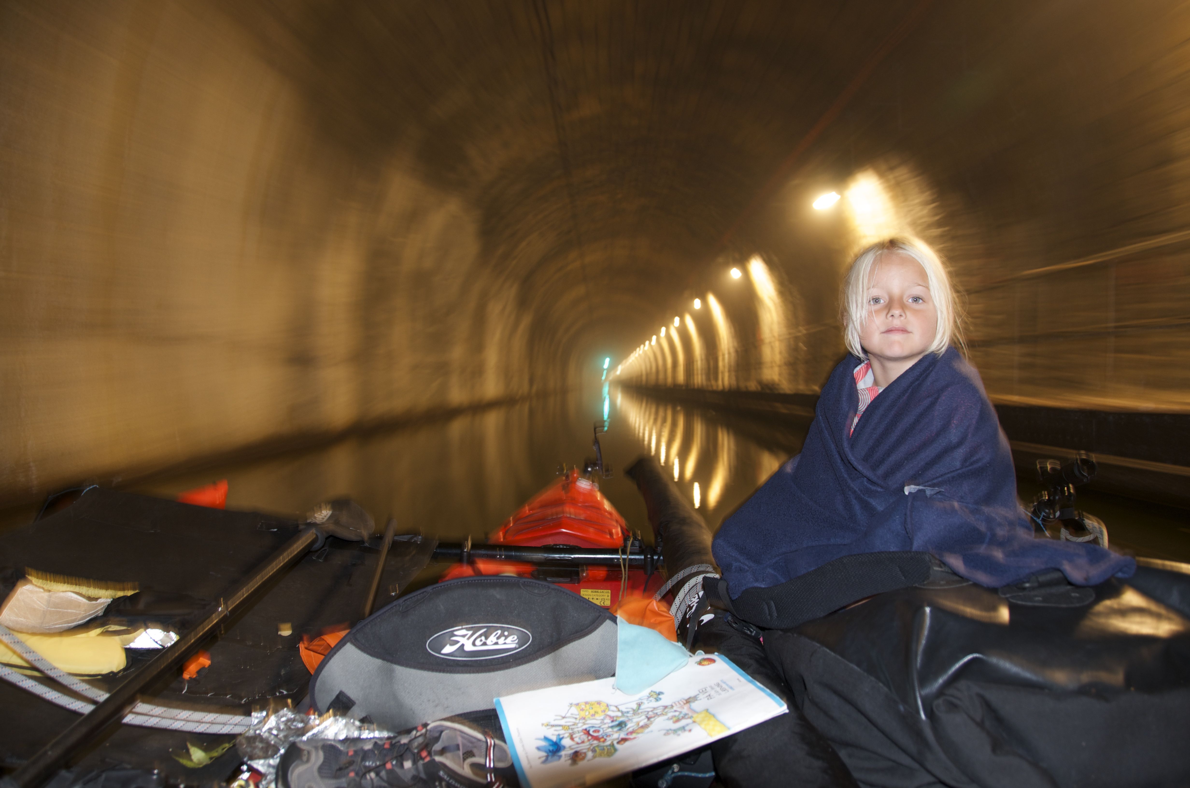 On the top a great moment / PĂĽ toppen et fedt øjeblikHere is the tunnel with the church on top / Her er tunnelen med kirken pĂĽ toppen.135 that’s us, time to go through the tunnel / 135 det er os, grøntlys til at paddle gennem tunnelen.The tunnel is 4,8 km long and cool / Tunnelen er 4,8 km lang of køligOn the other side we where welcomed by the VNF lock personal, they knew about us and where all there to say hi and take pictures. We have be spoiled by the VNF, great guys and girls / PĂĽ den anden side blev vi modtaget af en hel flok VNF sluse folk, som havde hørt om os og ville have en snak og billeder. Vi er virkelig brevet forkĂŚlet af VNF personale, det har vĂŚret en sand fornøjelse.