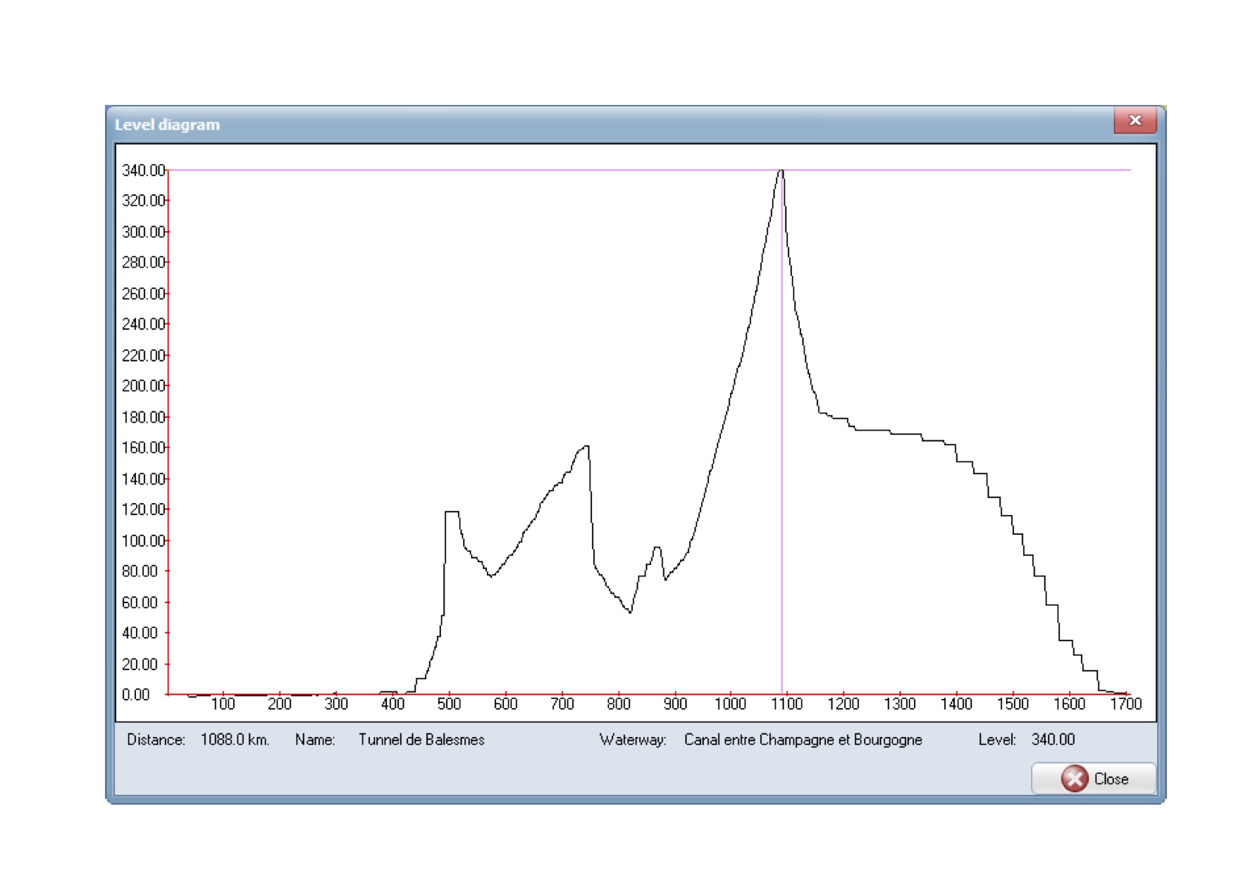 Ville lige vise Jer en diagram af vores rejse gennem kanalerne fra Holland til Middelhavet. Vi har lige passeret det højeste punkt pĂĽ turen 340 meter over havets overflade. Her fra er det ned af bakke hele vejen. đ