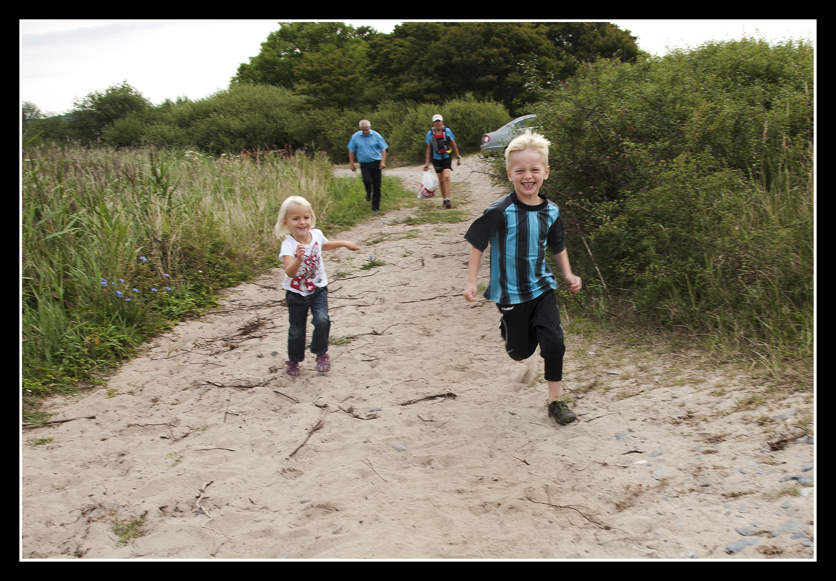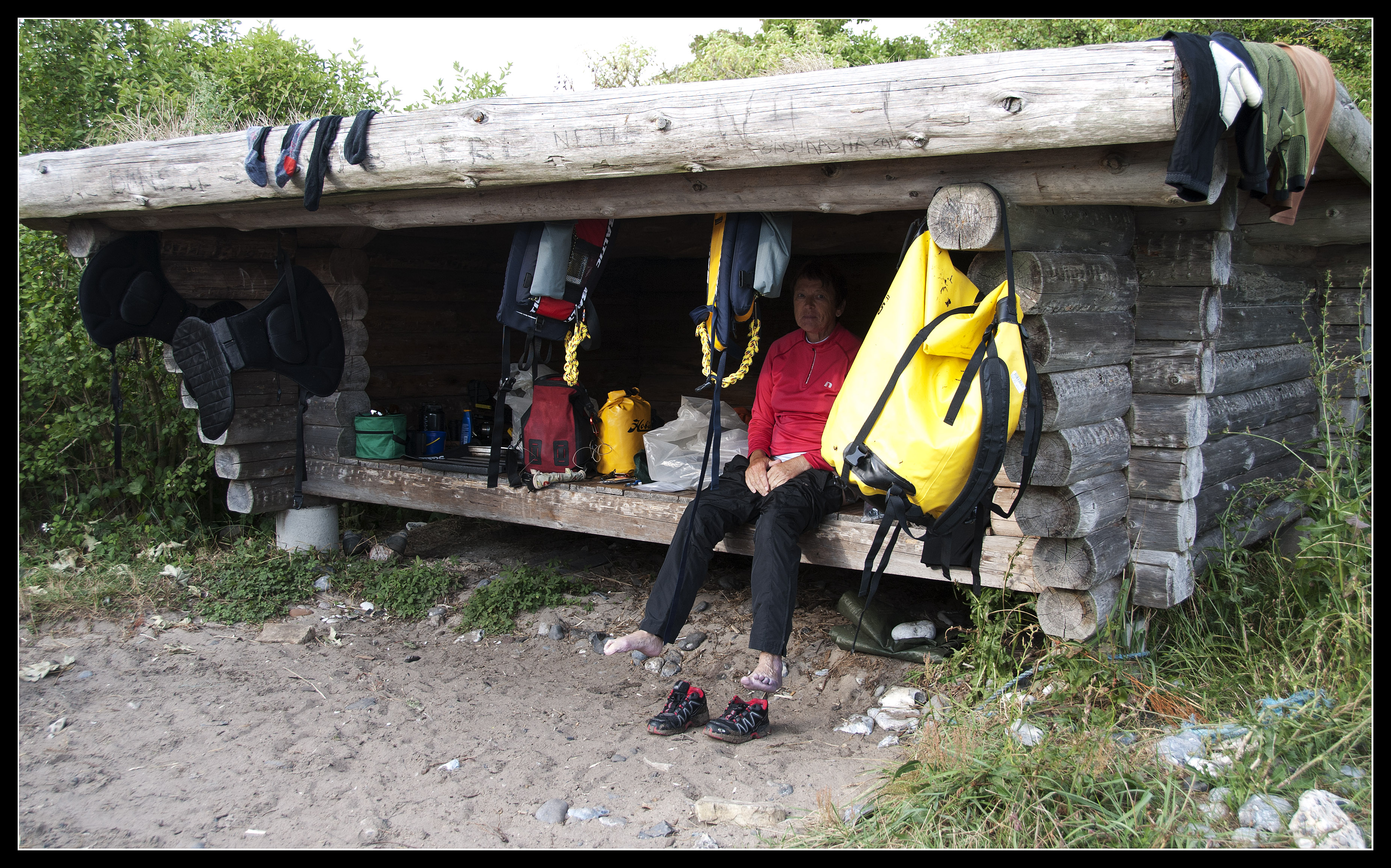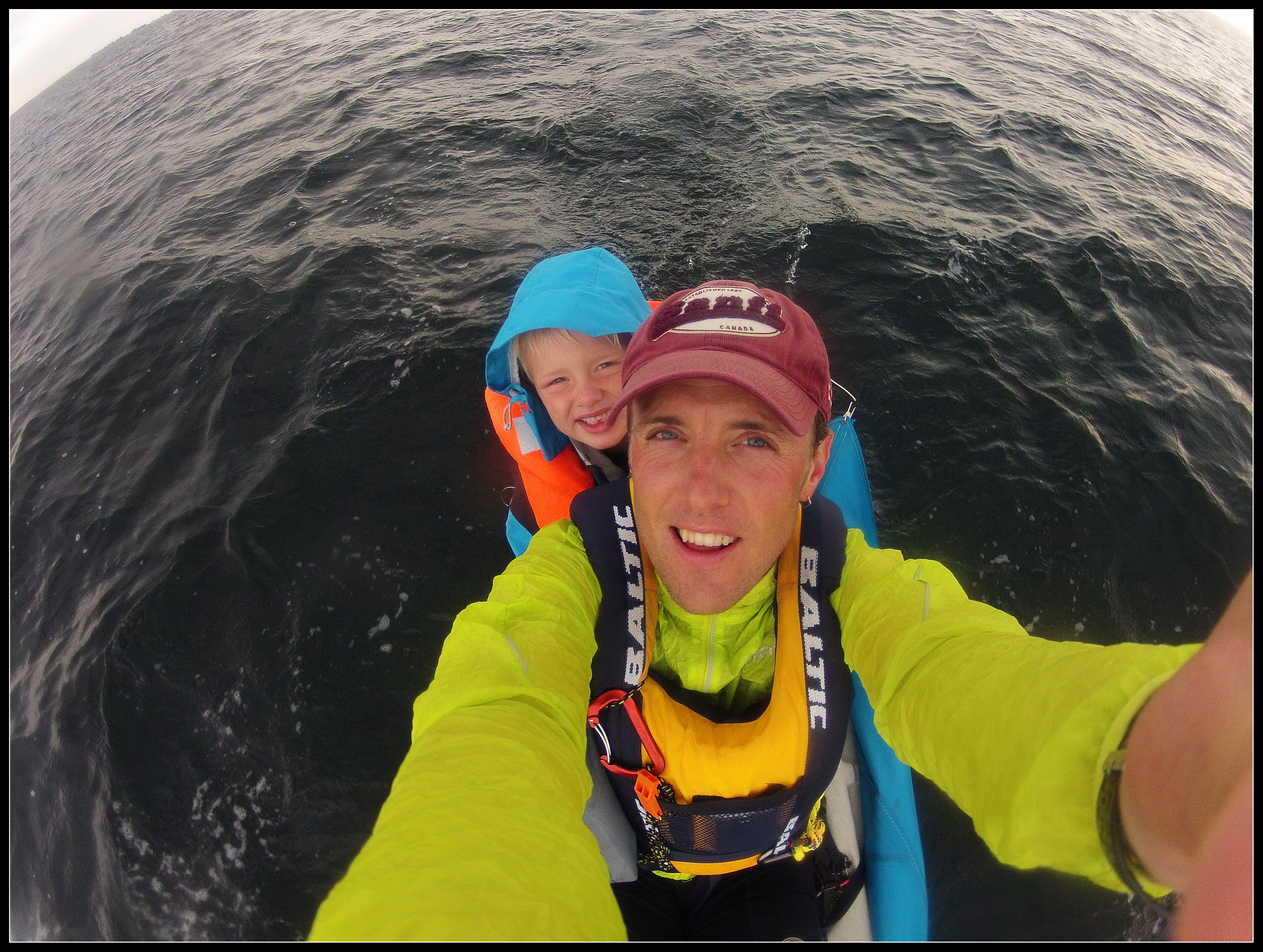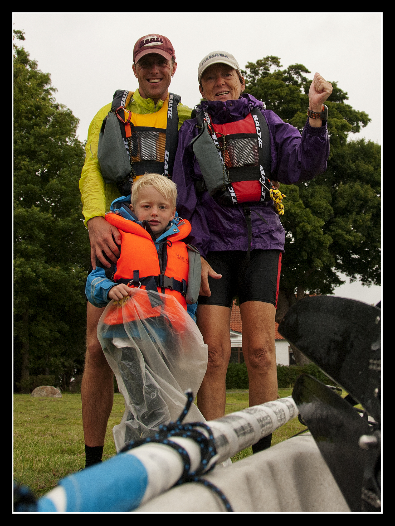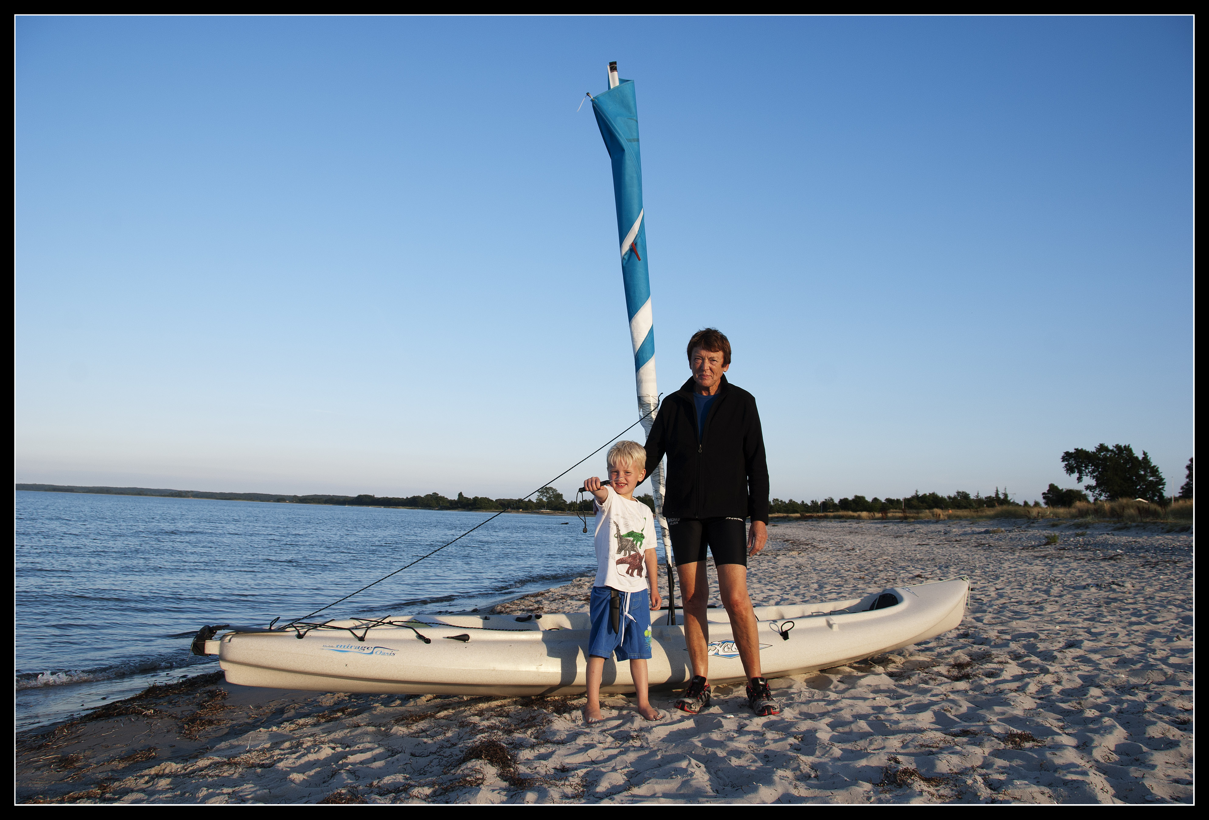 4 km. før mål, måtte vi lægge til land, fordi Tiuri er helt gennem kold. Hver en bølge slå ind over kajakken og han sad lige i vinden. Tørt tøj på, ned i en store plastik pose, hvor han kunne ligge og hygge sig. Små 20 min. senere var han klar igen. Vi blev også lige ringet op af Farfar, han kunne se at vi stod stille og spurte om han skulle hente os. NEJ TAK de sidste 4 km. skulle klares, om så himmel og hav stod i et. Det begyndte faktisk at blæse mere op, omkring de 11-12 ms., men vi klare det med Tiuri i plasticpose omme bag på. Stolte kunne vi gå i land, næsten 90 km. på tre dage, totalt sejt gået, af en mor på 61 år og min søn på 6 år!!!